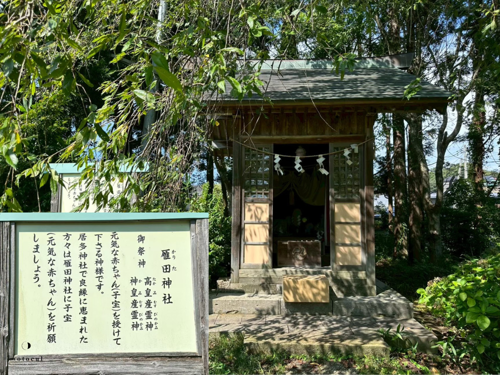 境内には雁田神社があり、「元気な赤ちゃんを授けてくれる神様」の高皇産霊神と神皇産霊神の二柱の神様が祀られている子宝スポットです。